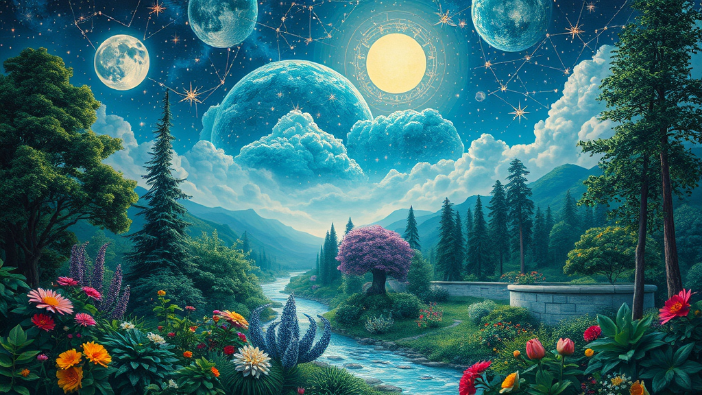 Celestial garden mural intertwining ethereal skies with lush foliage, where shimmering stars blend seamlessly with vibrant flowers, moonlit streams flow amidst ancient trees, and constellations form intricate patterns above verdant landscapes.