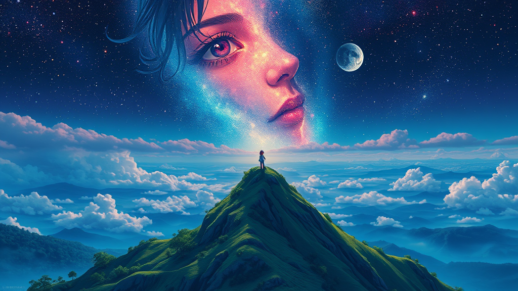 Celestial girl | perched atop a serene hill | perfectly centered | exquisitely detailed, mesmerizing face | anime style | key visual | rich, intricate details | awe-inspiring | vivid colors | sweeping panoramic view | cinematic flair | reminiscent of Carne Griffiths' ethereal touch | infused with Conrad Roset's colorful elegance | Studio Ghibli's enchanting essence.