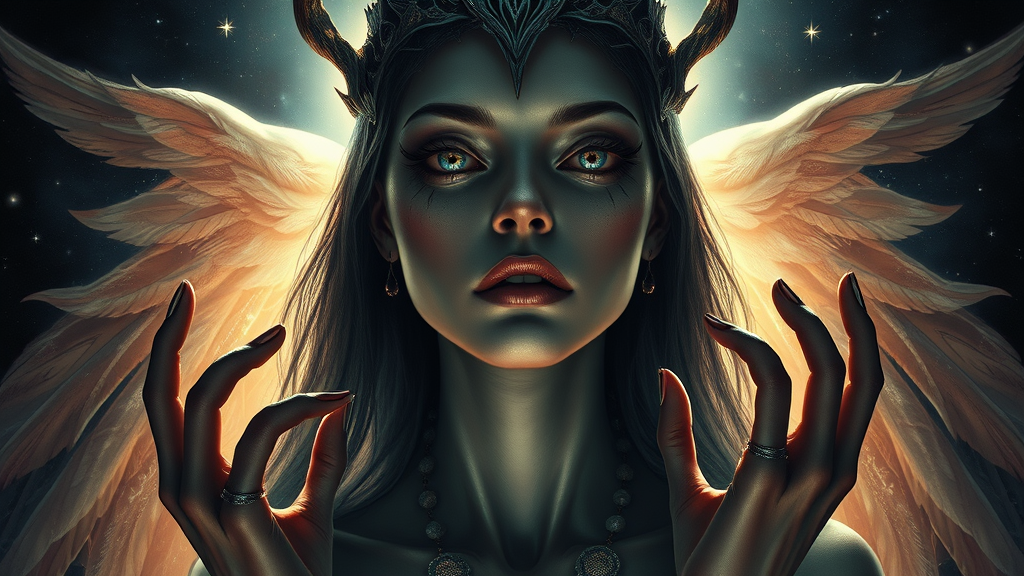Celestial goddess in the style of Boris Vallejo, with a hyper-detailed and realistic face, dramatic illumination creating a dark cinematic atmosphere, showcasing deformed iris and pupils, cross-eyed and enigmatic gaze. Her ethereal presence is highlighted by unrealistically elongated features, such as a long neck and subtly mutated hands with extra fingers. The scene captures her supernatural allure in a high-resolution, ultra-high definition 16k HDR depiction, ensuring intricate textures and colors. Crafted to evoke a dreamlike and otherworldly ambiance, the portrayal emphasizes an artistic fantasy realm, free from any modern digital artifacts such as text, signatures, watermarks, or other creator marks, maintaining the purity and mystical essence of the artwork. The portrayal balances on the edge of reality and imagination, invoking a sense of wonder and intrigue.