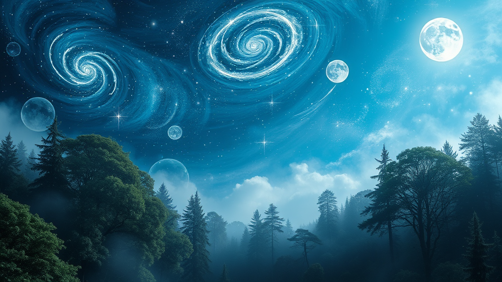Celestial landscape featuring an ethereal sky adorned with swirling galaxies and shimmering stars, seamlessly blending into a lush forest bathed in silver moonlight, delicate wisps of mist weaving through ancient trees, creating a harmonious fusion of cosmic wonder and earthly tranquility.