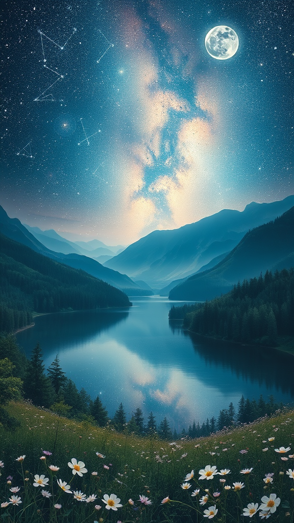 "Celestial tapestry blending starry skies with ethereal landscapes, featuring luminescent constellations weaving through verdant forests and shimmering galaxies mirrored in tranquil lakes, where moonlit meadows cradle blossoming flowers beneath a canopy of twinkling astral lights."