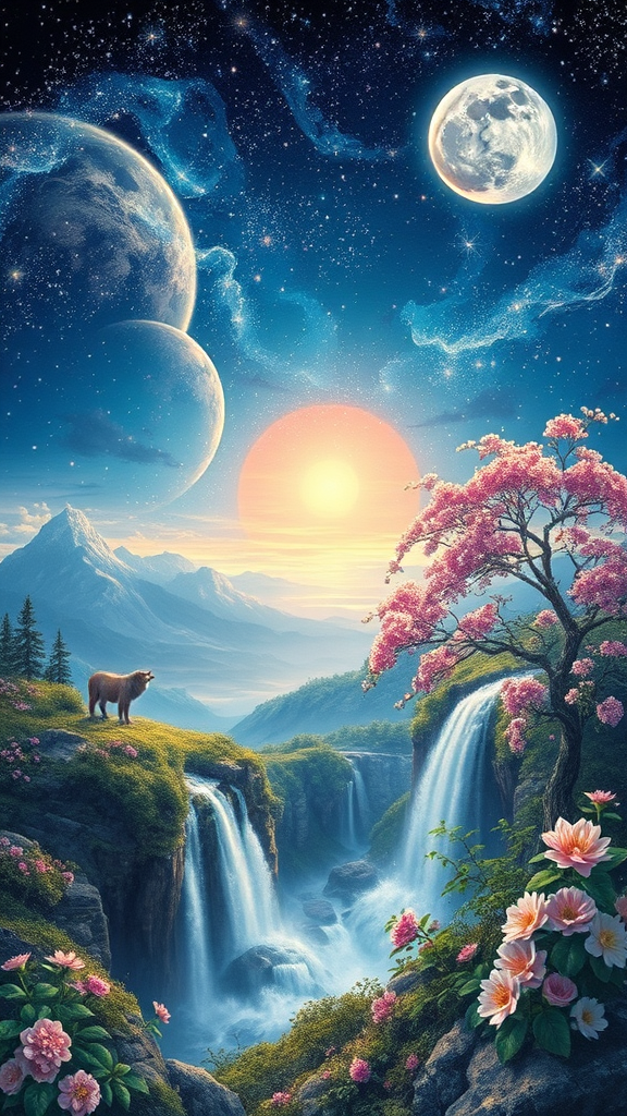 Celestial tapestry featuring an ethereal blend of starry skies and lush landscapes, with shimmering constellations entwined with blooming flora, cascading waterfalls reflecting the glow of a full moon, and distant mountains merging seamlessly with the horizon, creating a dreamlike panorama that evokes a sense of wonder and harmony between the cosmos and the earth.