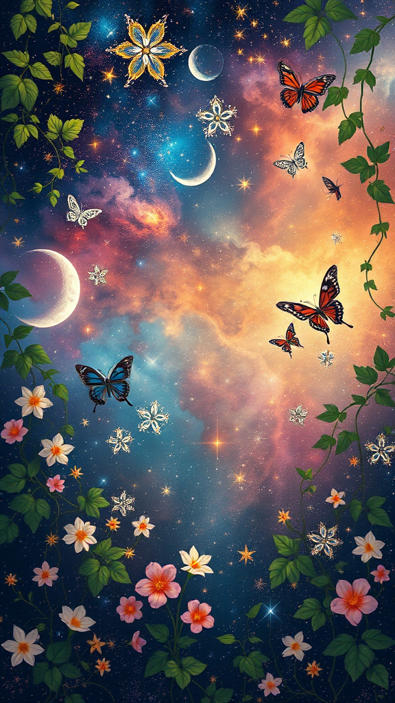 Celestial tapestry of stars intertwined with verdant vines and blooming flowers, where ethereal butterflies flutter amidst nebulae and crescent moons peek through a canopy of cosmic leaves, creating a harmonious blend of universe and earth.