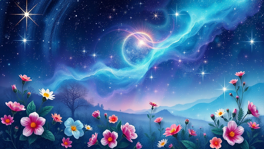 Celestial-themed wallpaper design featuring intertwining cosmic elements and lush natural landscapes, where shimmering stars blend seamlessly with vibrant flowers and ethereal foliage, creating a harmonious fusion of the universe and earth's beauty, all enveloped in a dreamy color palette of midnight blues, deep purples, and soft greens.