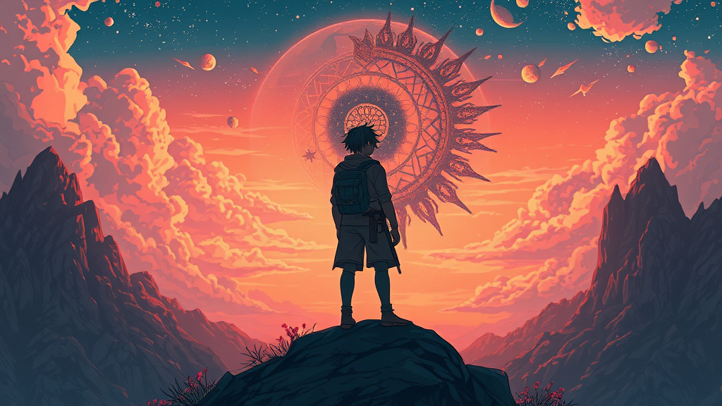 Celestial wanderer gazing from hilltop, solitary figure, centered frame, stunningly detailed visage, anime-inspired style, key visual emphasis, exquisite intricacy, highly detailed composition, awe-inspiring, vivid hues, expansive view, cinematic scope, reminiscent of Carne Griffiths and Conrad Roset, echoes of Studio Ghibli charm.
