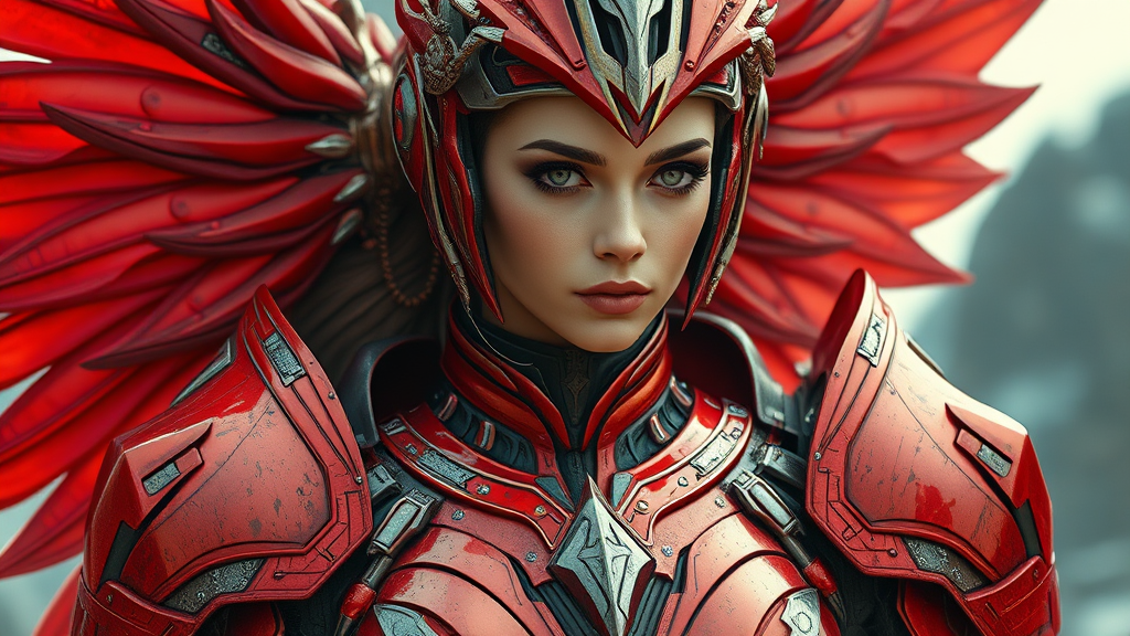 Celestial warrior goddess adorned in exquisite futuristic space armor, a vision of divine beauty. Her battle-worn red armor is intricate and elegant, exuding a hyperrealistic, cinematic presence. Though her appearance is slightly marred by signs of combat and the passage of time—like jpeg artifacts, missing fingers, and extra digits—she remains a figure of power and grace. Her form might be occasionally disfigured or blurred at the edges, with hints of anatomical quirks, but her essence as a celestial knight shines through. Despite potential imperfections, her presence is otherworldly and captivating, reminiscent of a sci-fi epic where decadence meets destiny.