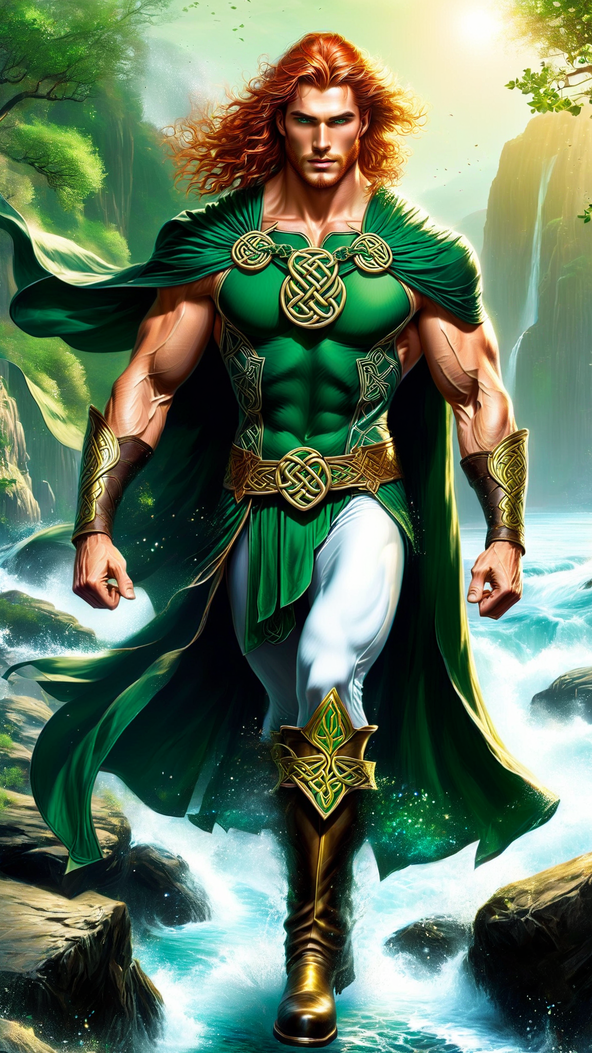 Celtic/Irish super-hero, possibly related to faeries or elves. Hypermasculine male. Short curly fade Scarlet red hair. Handsome face, strong brow and chiseled jaw, clean shaven . Glowing emerald green eyes, soulful stare. Tall, strong, brawny, muscular, sinewy. Wide back and shoulders, narrow waist. Red hair on chest, torso, abs and arms. Green vest trimmed with golden Celtic motif, exposed chest. White tights/pants with green Celtic designs. Metallic gold belt around waist, gold bracers on arms. Green knee-high boots with tops folded down, trimmed with gold. Flowing deep green cape with golden triskele design on the back. Full body pose, standing on rocks, wind blowing cape and hair. Sparkling gold aura.