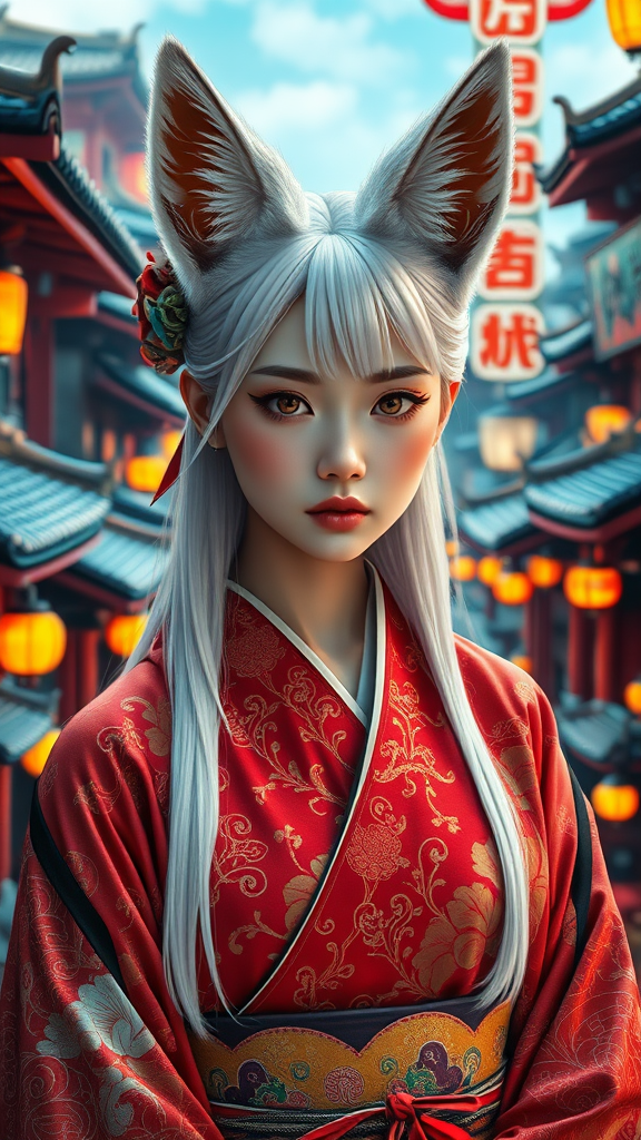 Centered medium shot of a full-body, hyperdetailed portrait featuring a young woman with fox ears, wearing an intricately designed kimono. She has a perfect face with white long hair parted in the middle, displaying an anxious expression. The background is a colorful, glamorous, and hyperdetailed depiction of a medieval Japanese city, enriched with vibrant colors. The scene exudes elegance and grace, enhanced by cinematic lighting and special effects. The image is captured with a high-definition octane render, showcasing a professional, studio-lit photograph. The atmosphere is enriched further by the trending aesthetic popular on art platforms like ArtStation, with HDR and UHD quality, producing a stunning 64k resolution.