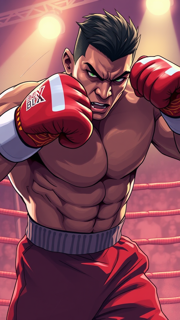 Centerpiece illustration of a powerful man in a boxing ring, showcasing a hyper detailed anime style, inspired by the artistic approaches of jazza, rossdraws, and kawacy. The scene captures the dynamic moment of a punch being thrown, emphasizing a strong, chiseled chin. This card game illustration exudes the captivating vibrancy found in trending Artstation pieces. Designed for a profile picture, the artwork channels elements of Sachin Teng's stylistic nuance and the dynamic presence akin to a Will Smith anime rendition.