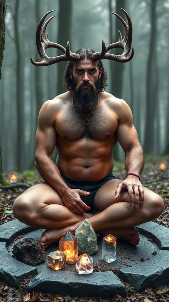 Cernunnos. Ancient Celtic god. God of animals, sex, magic. He is tall, muscular, big muscles, broad back, wide shoulders, broad muscular hirsute hairy chest and abs. Physically fit, perfect body {{{hirsute hairy chest and abs}}} Strong hairy muscular legs. He is naked, so he sits crossed-legged with an erect phallus. He sits inside a stone circle with various crystals within it-- they are lit up from his magic. His face is strong, rugged, masculine and handsome. Model face. He wears a short, well trimmed Beard. His hair is dark brown and loose curls in a medium length bobbed hairstyle with wild bangs gently falling over his forehead. He has antlers like a stag that curve upward and outwards from his temples. His eyes are bright and flash of star-fire, lit up like stars. There is a golden torc around his neck, the ends of it have gems. It is the twighlight hour in the forest, so we are unsure whether the sun is rising or setting. There may be various animals coming to watch his magic. Full body pose {{{he is naked}}}