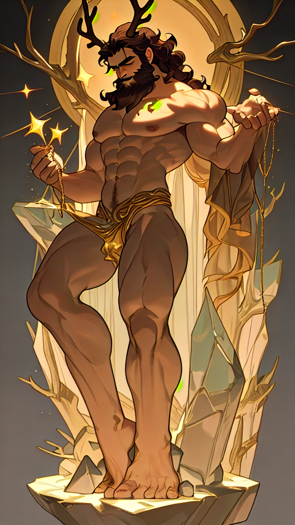 Cernunnos. Ancient Celtic god. God of animals, sex, magic. He is tall, muscular, big muscles, broad back, wide shoulders, broad muscular hirsute hairy chest and abs. Physically fit, perfect body {{{hirsute hairy chest and abs}}} Strong hairy muscular legs. He is naked, so he sits crossed-legged with an erect phallus. He sits inside a stone circle with various crystals within it-- they are lit up from his magic. His face is strong, rugged, masculine and handsome. Model face. He wears a short, well trimmed Beard. His hair is dark brown and loose curls in a medium length bobbed hairstyle with wild bangs gently falling over his forehead. He has antlers like a stag that curve upward and outwards from his temples. His eyes are bright and flash of star-fire, lit up like stars. There is a golden torc around his neck, the ends of it have gems. It is the twighlight hour in the forest, so we are unsure whether the sun is rising or setting. There may be various animals coming to watch his magic. Full body pose {{{he is naked}}}