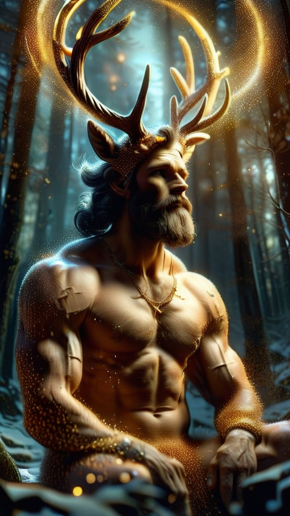 Cernunnos. Ancient Celtic god. God of animals, sex, magic. He is tall, muscular, big muscles, broad back, wide shoulders, broad muscular hirsute hairy chest and abs. Physically fit, perfect body {{{hirsute hairy chest and abs}}} Strong hairy muscular legs. He is naked, so he sits crossed-legged with an erect phallus. He sits inside a stone circle with various crystals within it-- they are lit up from his magic. His face is strong, rugged, masculine and handsome. Model face. He wears a short, well trimmed Beard. His hair is dark brown and loose curls in a medium length bobbed hairstyle with wild bangs gently falling over his forehead. He has antlers like a stag that curve upward and outwards from his temples. His eyes are bright and flash of star-fire, lit up like stars. There is a golden torc around his neck, the ends of it have gems. It is the twighlight hour in the forest, so we are unsure whether the sun is rising or setting. There may be various animals coming to watch his magic. Full body pose {{{he is naked}}}