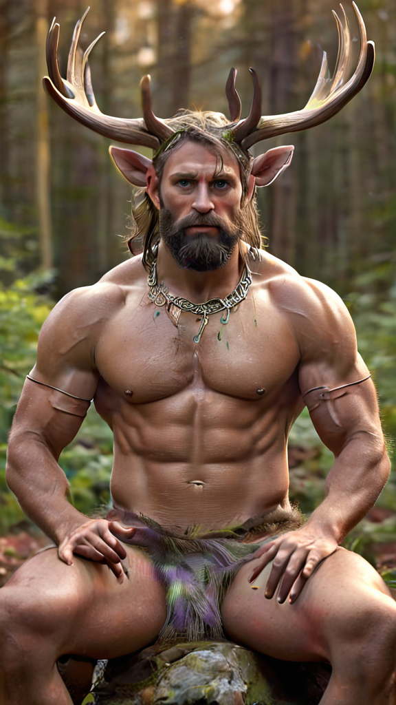 Cernunnos. Ancient Celtic god. God of animals, sex, magic. He is tall, muscular, big muscles, broad back, wide shoulders, broad muscular hirsute hairy chest and abs. Physically fit, perfect body {{{hirsute hairy chest and abs}}} Strong hairy muscular legs. He is naked, so he sits crossed-legged with an erect phallus. He sits inside a stone circle with various crystals within it-- they are lit up from his magic. His face is strong, rugged, masculine and handsome. Model face. He wears a short, well trimmed Beard. His hair is dark brown and loose curls in a medium length bobbed hairstyle with wild bangs gently falling over his forehead. He has antlers like a stag that curve upward and outwards from his temples. His eyes are bright and flash of star-fire, lit up like stars. There is a golden torc around his neck, the ends of it have gems. It is the twighlight hour in the forest, so we are unsure whether the sun is rising or setting. There may be various animals coming to watch his magic. Full body pose {{{he is naked}}}