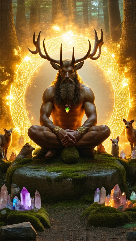 Cernunnos. Ancient Celtic god. God of animals, sex, magic. He is tall, muscular, broad back, wide shoulders, broad muscular hirsute hairy chest and abs. Strong hairy muscular legs. He is naked, so he sits crossed-legged with an erect phallus. He sits inside a stone circle with various crystals within it-- they are lit up from his magic. His face is strong, rugged, masculine and handsome. He wears a short, well trimmed Beard. His hair is dark brown and loose curls in a medium length bobbed hairstyle, wild Bangs gently falling over his forehead. He has antlers like a stag that curve upward and outwards from his temples. His eyes are bright and flash of star-fire. There is a golden torc around his neck, the ends of it have gems. It is the twighlight hour in the forest, so we are unsure whether the sun is rising or setting. There may be various animals coming to watch his magic. Full body pose {{{he is naked, phallus long and fully erect}}}