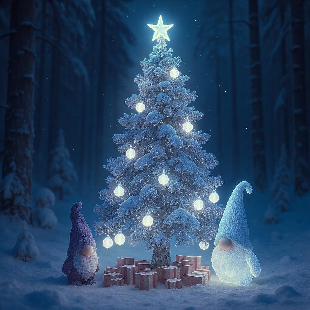 Cgi enchanted winter tree with luminescent ornaments, accompanied by a Kaws-inspired Nordic gnome, luminous highlights, set against a gradient winter forest backdrop, rendered in Unreal Engine with Octane-like precision.