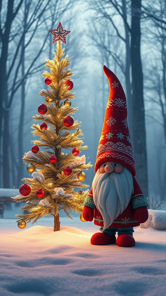 Cgi-New Year tree adorned with glowing ornaments, beside it a Scandinavian Christmas gnome styled in Kaws fashion, featuring vibrant hues and whimsical patterns, set against a dreamy gradient backdrop of a winter forest, rendered with Unreal Engine and Octane, casting soft, ethereal reflections on the snow.