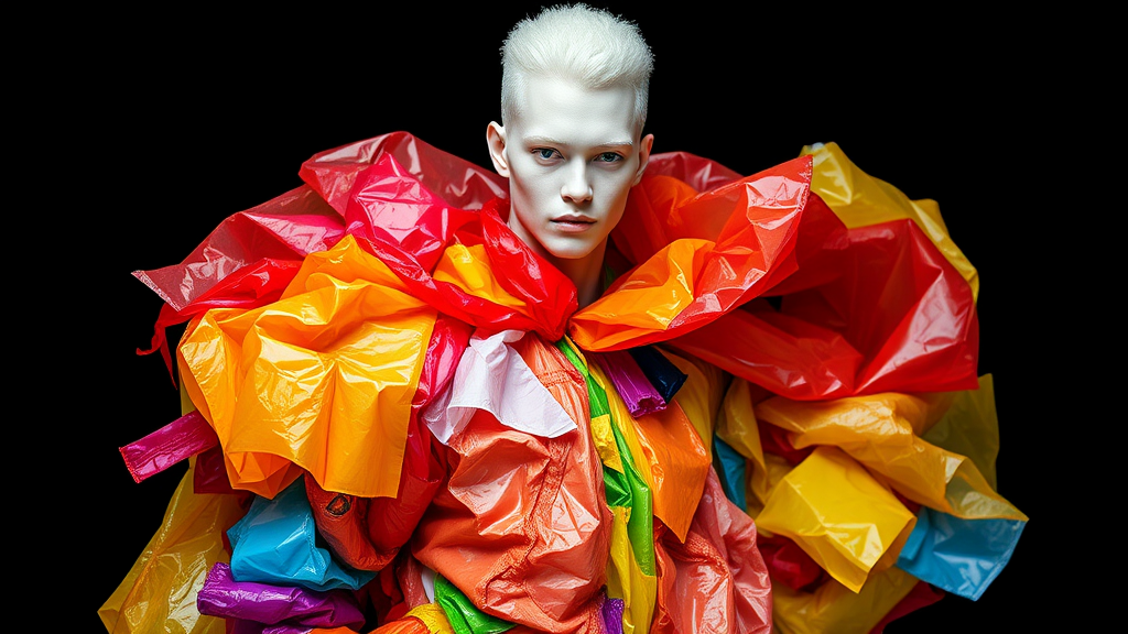Challenging fashion norms with audacity and inclusivity, this albino male model captivates in a unique garment crafted from vibrant plastic bags. A testament to individuality and limitless style, celebrating the rich diversity and beauty of fashion.