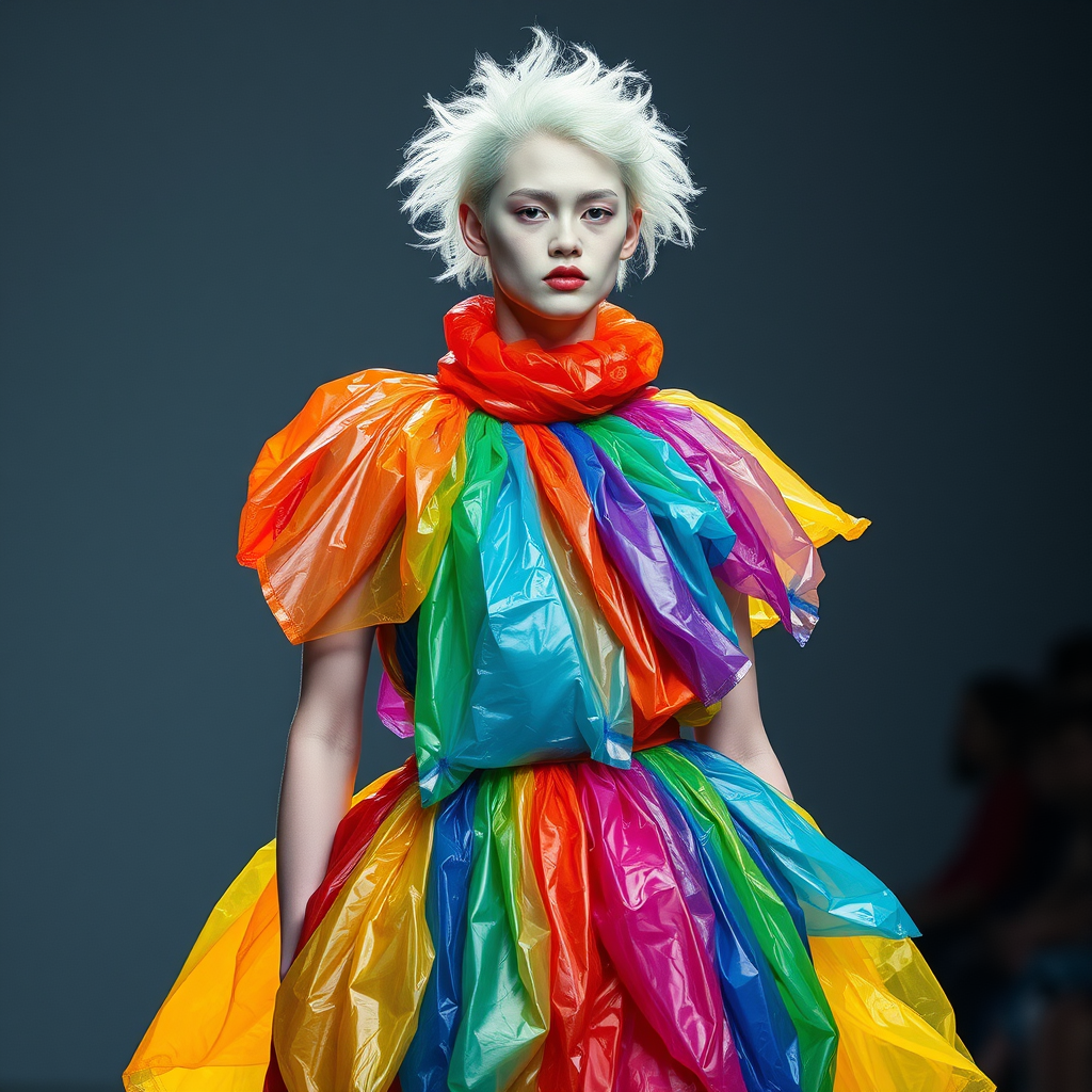 Challenging fashion norms with courage and inclusivity, this albino male model captivates in a striking dress crafted from vibrant, repurposed plastic bags. A celebration of personal expression and limitless style, showcasing the rich diversity and beauty within the fashion world.