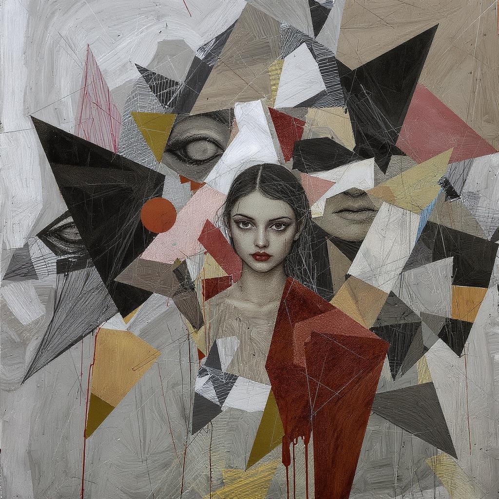 Chaotic composition, blurred resolution, fragmented shapes, rough sketches, uneven lines, low clarity imagery, disorganized drawing, imprecise outlines, distorted features, misshapen, disordered structure, asymmetrical expressions, misaligned gaze.
