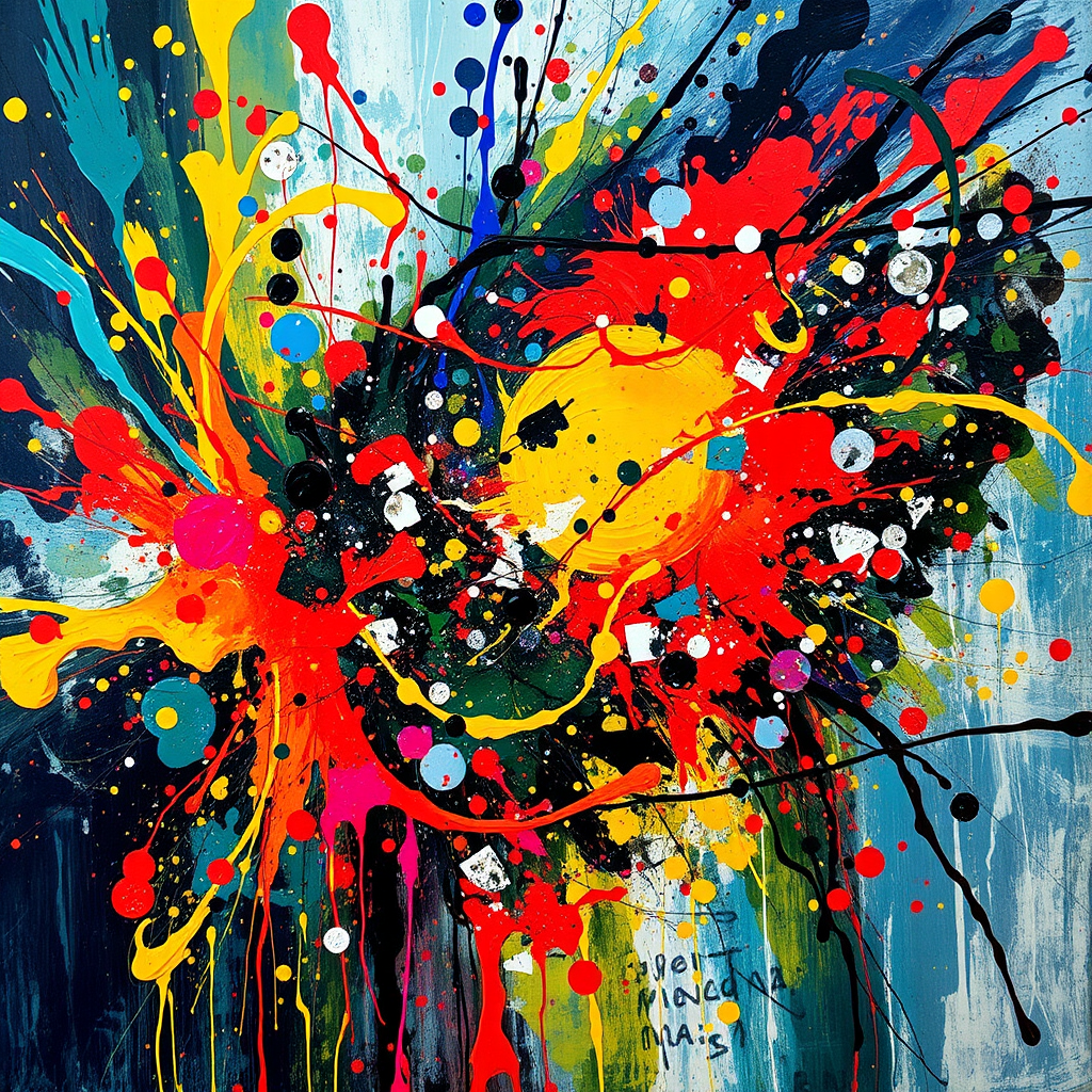 Chaotic symphony of swirling colors and intricate splatters, capturing the essence of an artist's tumultuous soul; each stroke a burst of emotion, a dance of abstract energy, embodying the raw intensity and frenetic passion of creativity in its prime. Vibrant hues meld and clash, forming a fragmented mirror of the mind, where spontaneity reigns supreme and every drop of paint tells its own story within the larger narrative, revealing glimpses of introspection and unrestrained freedom.