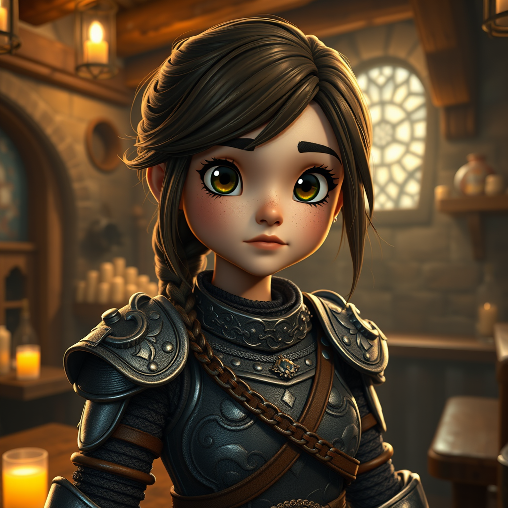 Character cleric in chain mail, a chibi-style woman in a medieval tavern setting, inspired by Disney artwork with cozy indoor lighting. A blend of fantasy and artstation aesthetics with influences from Mark Ryden, Pixar, and Hayao Miyazaki. Rendered in Unreal Engine 5 with hyperrealistic details and a cinematic feel. The scene captures her with subtle freckles, amidst a warm, inviting atmosphere. Despite the artistic inspiration, the character maintains distinct, charming features with careful attention to anatomy, lighting, and composition, ensuring high quality and clarity in every aspect.