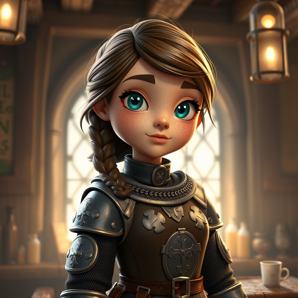 Character cleric in chain mail, featuring a chibi-style design of a solo woman in a medieval tavern. Capturing the essence of Disney artwork with a touch of fantasy, inspired by artists like Mark Ryden, Pixar, and Hayao Miyazaki. Rendered in Unreal Engine 5 and Octane for hyperrealistic details, the scene is set with cozy indoor lighting. This digital painting is cinematic, detailed, and suitable for ArtStation. The design showcases a freckled face with charm and personality. While maintaining the essence of a medieval fantasy setting, the character has a friendly and approachable appearance with properly detailed anatomy. The environment and character are well-composed, reflecting high-quality digital art standards.
