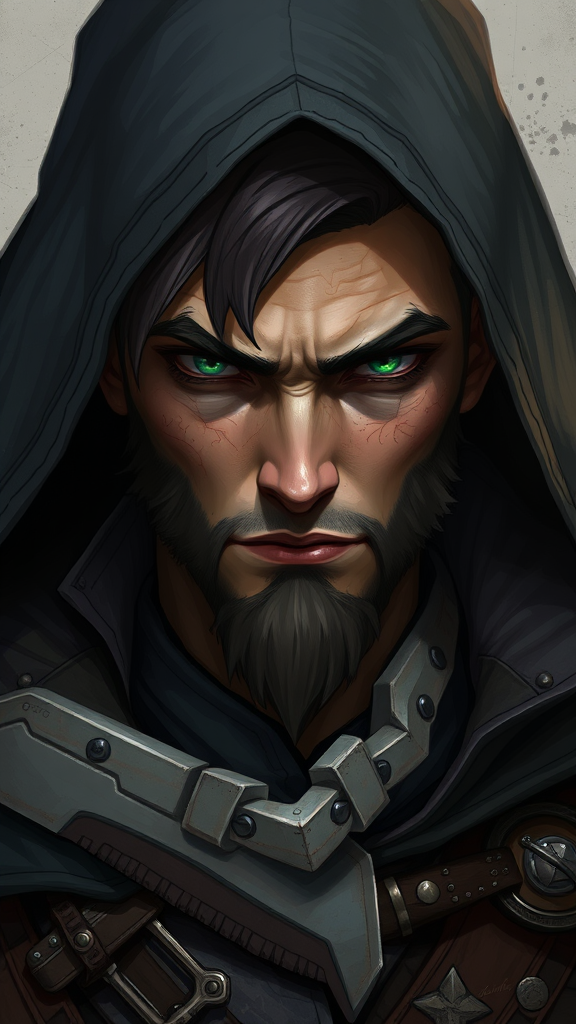 Character concept art| detailed male visage| stealthy rogue archetype| role-playing game| high-fantasy realm| harmonious facial features| Dungeons & Dragons inspiration| intricate attire and gear