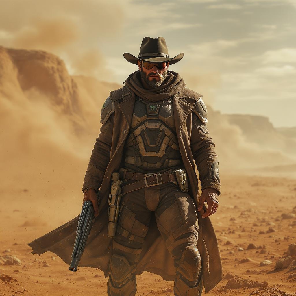 Character cowboy, futuristic ranger in a post-apocalyptic desert, expansive open landscape, wide angle view, equipped with a futuristic weapon, advanced rifle in hand, cinematic scene, high dynamic range, 8k resolution, aspect ratio 3:4, dust swirling in the arid breeze, harsh sunlight casting dramatic shadows, rugged terrain stretching to the horizon, elements of survival and resilience, blending traditional ruggedness with advanced technology.
