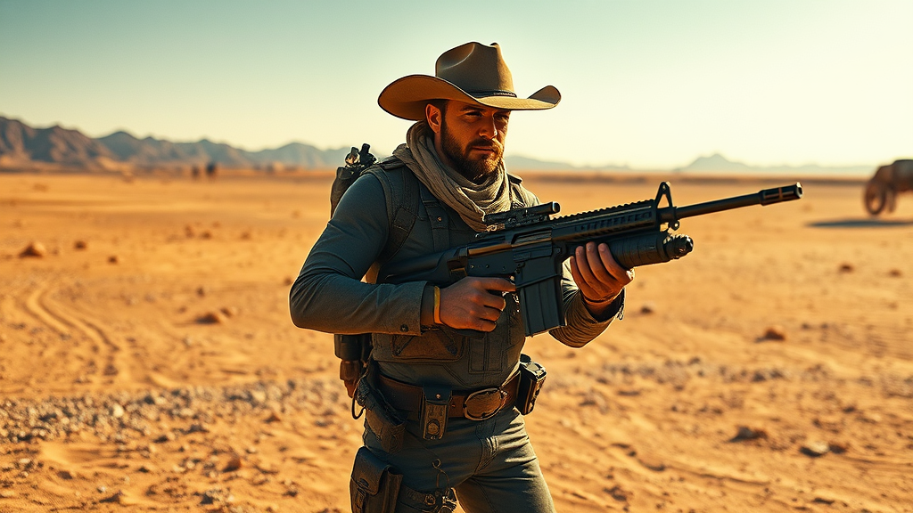 Character cowboy ranger in a futuristic post-apocalyptic desert landscape, standing in an expansive open desert, emphasizing a wide angle perspective. Equipped with a high-tech rifle, the scene is cinematic and detailed, capturing the vivid essence in HDR quality, rendered in ultra-clear 8k resolution with an aspect ratio of 3:4. The setting blends rugged western elements with advanced technological motifs, portraying a resilient figure amidst the desolate, sun-scorched terrain.