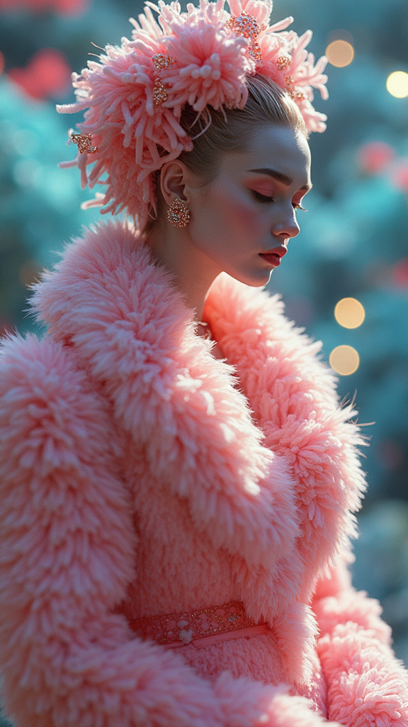 Character design with vibrant colors and sharp focus, blending the glamour of Vogue with the bold essence of Prada and Versace. This editorial fashion shoot captures an ethereal, extraterrestrial figure exuding a dreamy glow. Featuring an intricately detailed and cinematic style, the character is adorned in a fantastically realistic and kitsch outfit that stands out in the fashion world. The scene combines elements of fluff and otherworldly allure, resulting in a visually stunning image that feels both surreal and luxurious, perfectly suited for a high-fashion magazine spread.