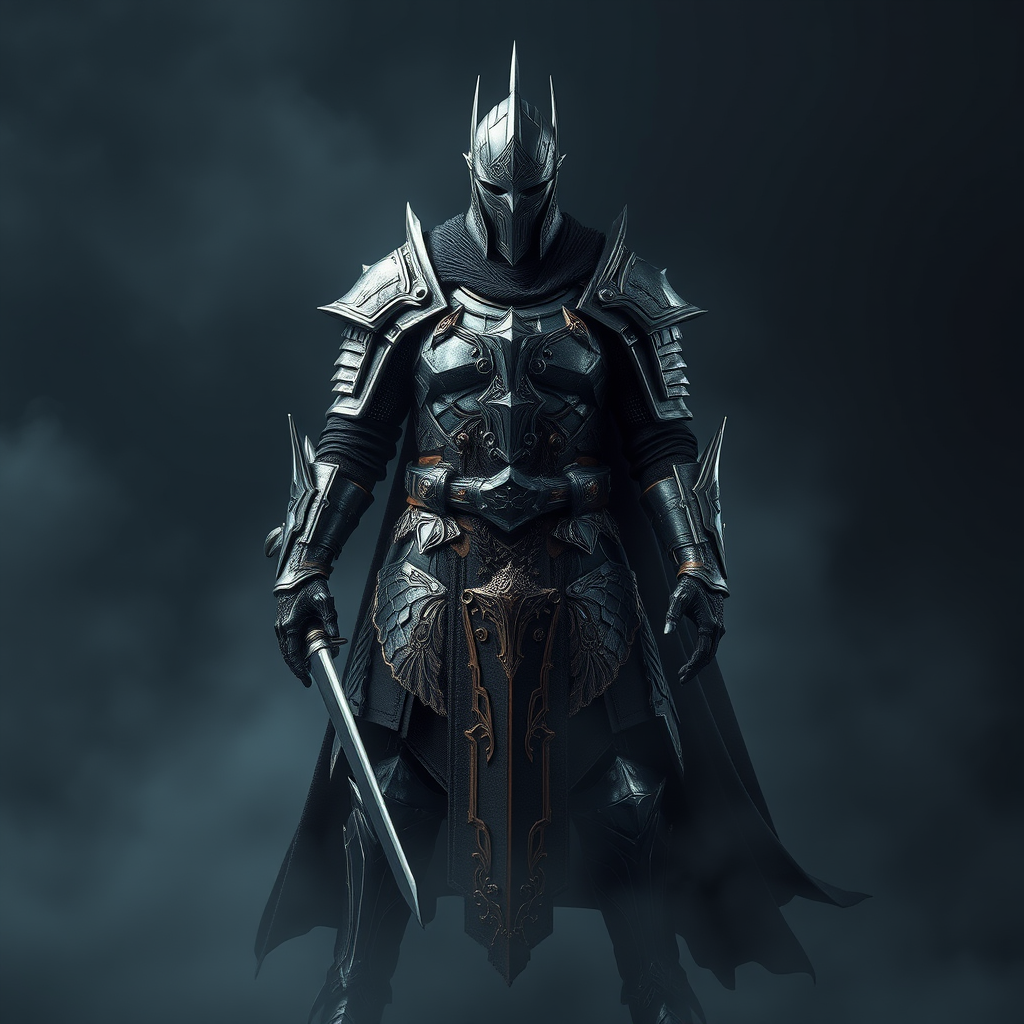 Character design of a dark souls-inspired knight, full body, shrouded in mist, photorealistic rendering using octane render and unreal engine, featuring hyper detailed textures and volumetric lighting, ultrarealistic with an 8k resolution, utilizing HDR technology, aspect ratio 9:16, with creative modifications focusing on intricate armor detailing and a mystical aura surrounding the character, ensuring atmospheric depth and a mysterious ambiance, version 5, emphasizing a dynamic stance and a rich color palette, stylized yet true to the core concept.