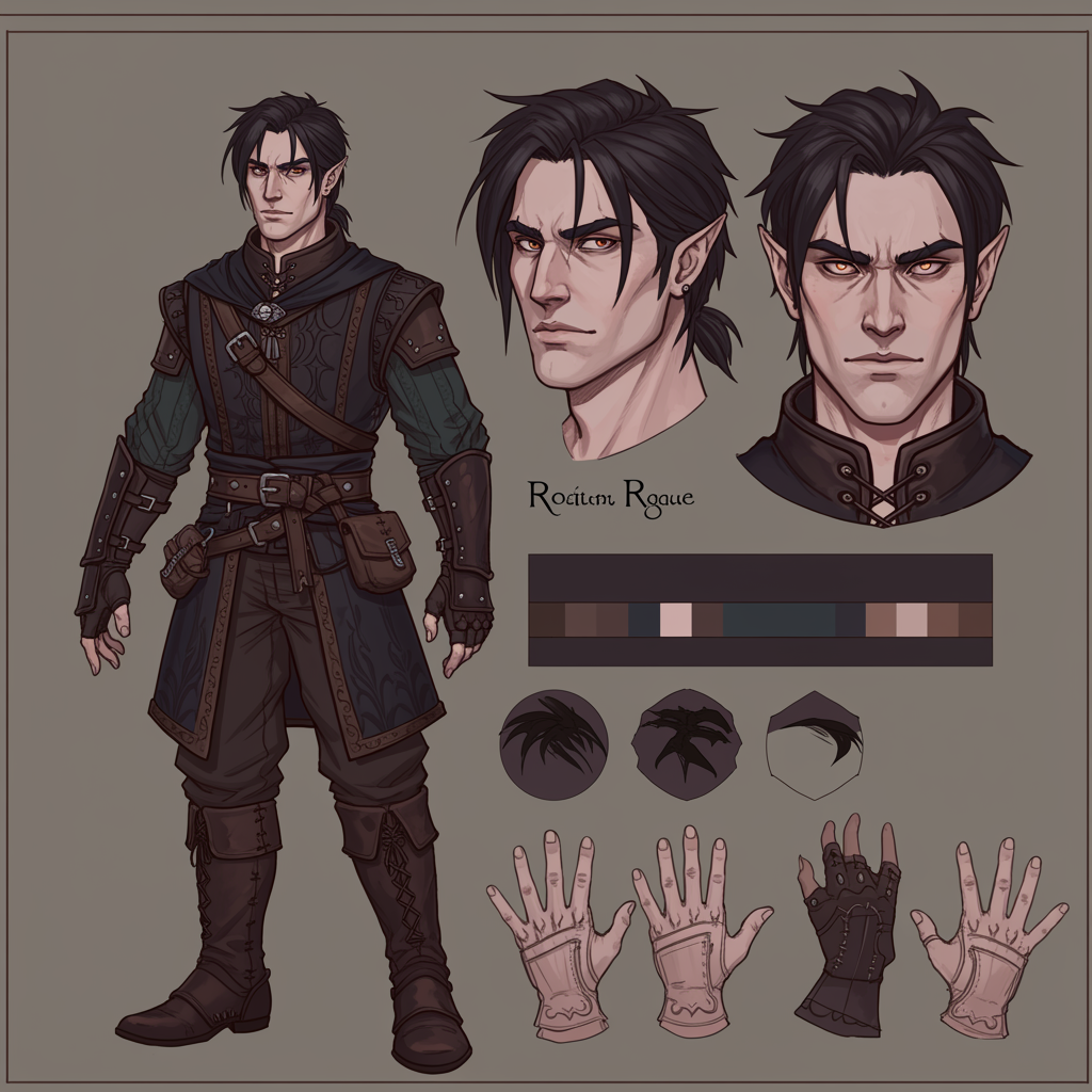 Character design reference sheet detailed male face rogue RPG fantasy symmetrical features dungeons dragons tabletop game imaginative nuances