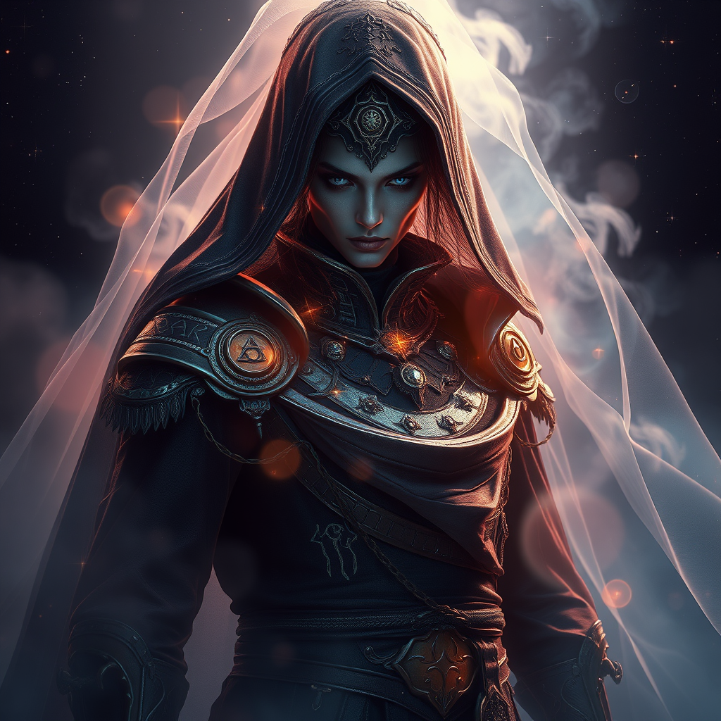Character design void arcanist, ethereal mist enveloping, photorealistic detailing elevated, octane render sharpness, unreal engine brilliance, hyper detailed intricacies, volumetric lighting casting an astral glow, hdr vibrancy enhanced, cinematic focus, arcane symbols subtly woven into fabric, dark celestial hues with glimmers of stardust, mystical aura emanating, background merging with cosmic patterns, atmosphere charged with energy, posture exuding mastery of void, captivating depth of gaze, enigmatic presence, aura intensely vivid, cinematic framing 9:16 aspect ratio.