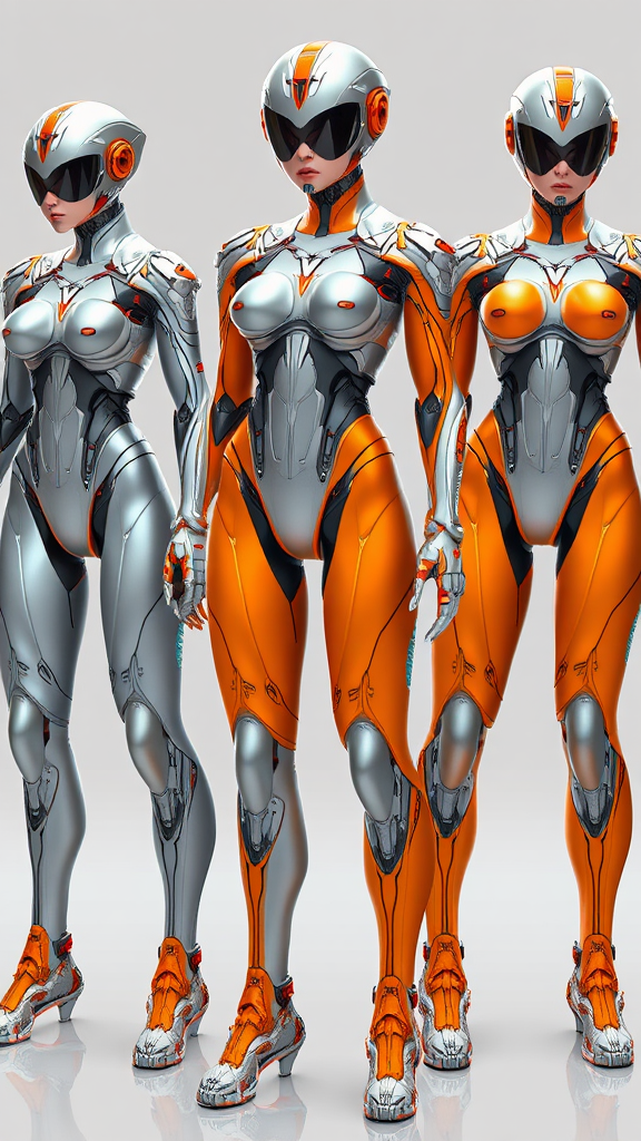 Character designs exhibiting diverse forms in a hyper-realistic sci-fi style, incorporating light gray and orange tones with a focus on advanced technological elements. Featuring feminine bodies crafted with precise details, these life-size figures showcase a harmonious blend of sleek silver and striking red accents. The designs reflect a futuristic aesthetic, merging organic shapes with mechanical intricacies to create a captivating and innovative visual representation.