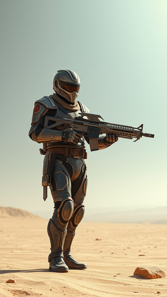 Character in a futuristic post-apocalyptic desert landscape, acting as a dedicated peacekeeper within a vast desert security force. Clad in intricately forged armor, this individual stands resolute under the expansive open sky, wielding a sleek futuristic energy rifle. The scene is vividly cinematic and captured in HDR, showcasing the stark beauty and harshness of the environment in stunning 8k clarity. The sweeping wide-angle view highlights the overwhelming solitude of the desert, adding to the sense of duty and resilience embodied by this lone guardian.
