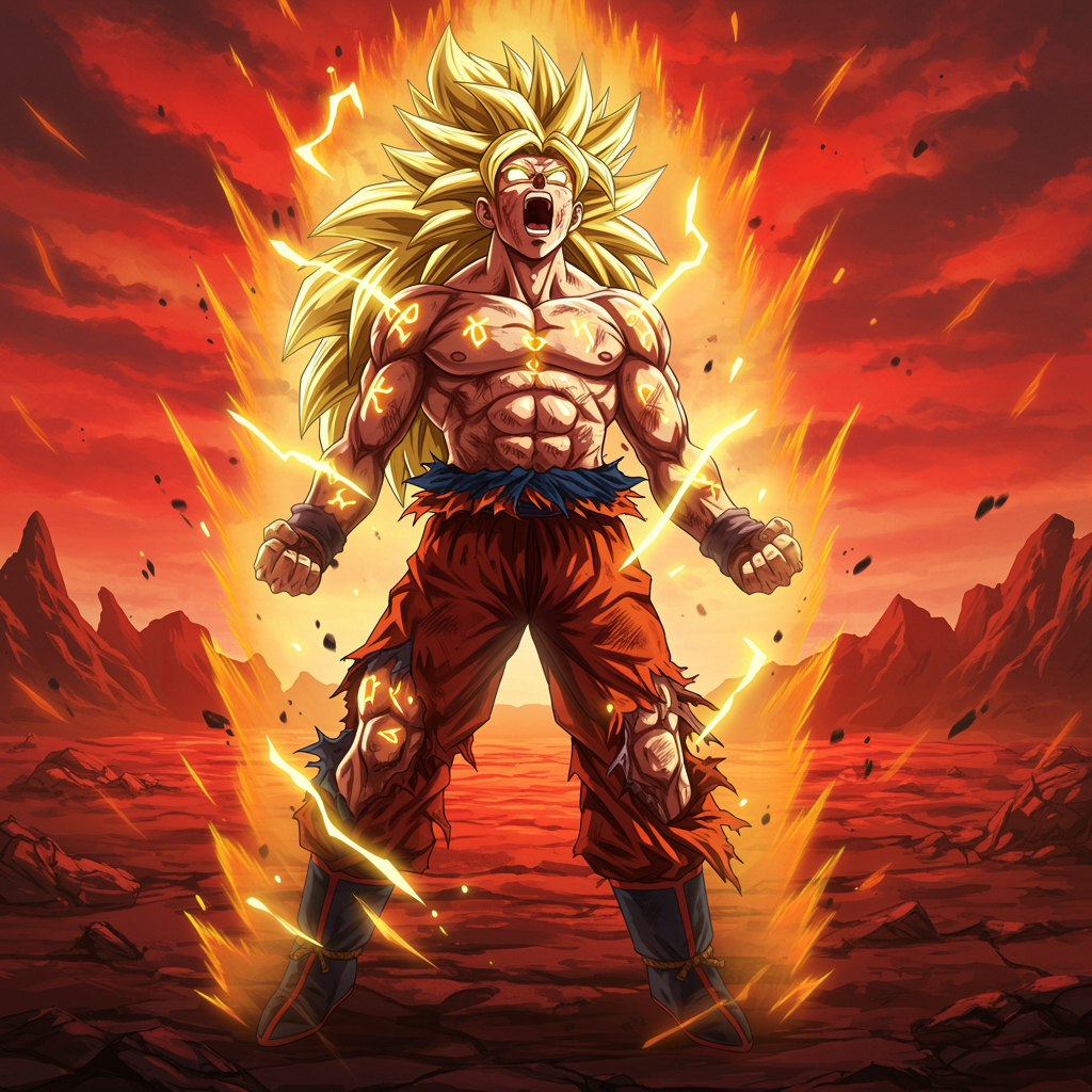 View this AI-generated image featuring a goku like character with exceptionally long flowing yellow hair stands amidst the chaos of war his eyes burning with intense rage in a berserk state he unleashes a primal scream as a massive surge of energy crackles and swirls around him his body bears numero