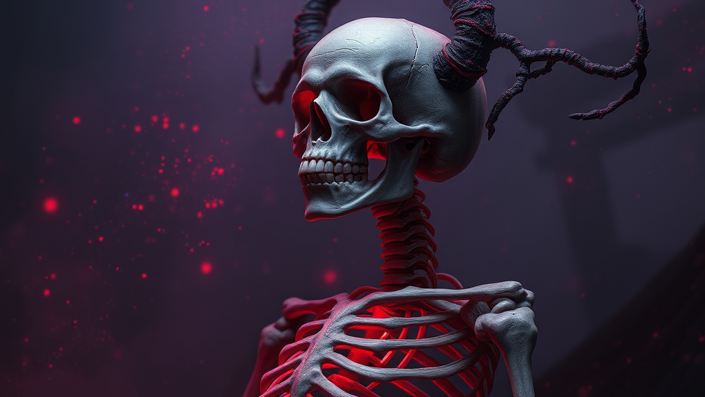 Character of ethereal skeletons art, fantasy imagery fused with celestial elements, atmospheric and moody wallpaper art in dark purples and rich reds, inspired by the artistic nuances of Magali Villeneuve and the celestialpunk genre, imbued with a dark and brooding aesthetic, hyper-realistic detail reminiscent of Zacharias Martin Aagaard's work, providing a hauntingly beautiful and intricately detailed portrayal of otherworldly skeletons.