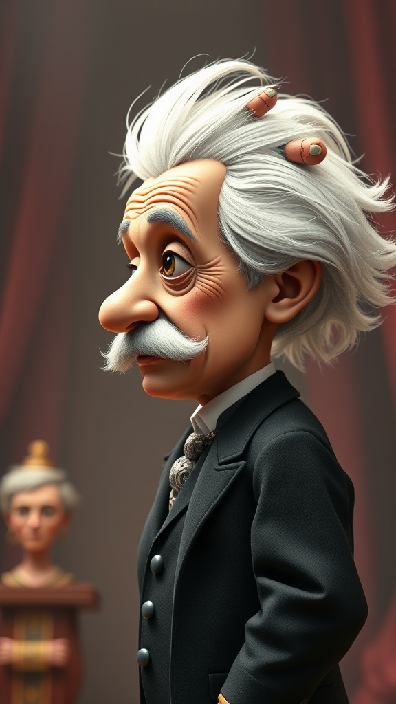 Character portrait of Albert Einstein, standing on stage in a side profile, combining caricature, chibi, and kawaii styles, depicted in 3D with octane rendering. The scene features volumetric light and Victorian-inspired fashion with a metallic twist, capturing a highly-detailed symmetrical face with expressive, detailed eyes. The rendering is ultra-sharp and of the highest quality, reminiscent of art by Anja Millen, George Cruikshank, and Bordalo II. This creation blends smooth lines and sharp focus, reflecting a style suitable for a kid's storybook with muted and watercolor-like colors. Integrating surreal elements with multiple heads, extra limbs, and otherworldly features, this artistic work encapsulates an abstract, dream-like essence, deliberately embracing malformed anatomy and exaggerated, playful distortions – including twisted fingers, elongated necks, and deformed hands.