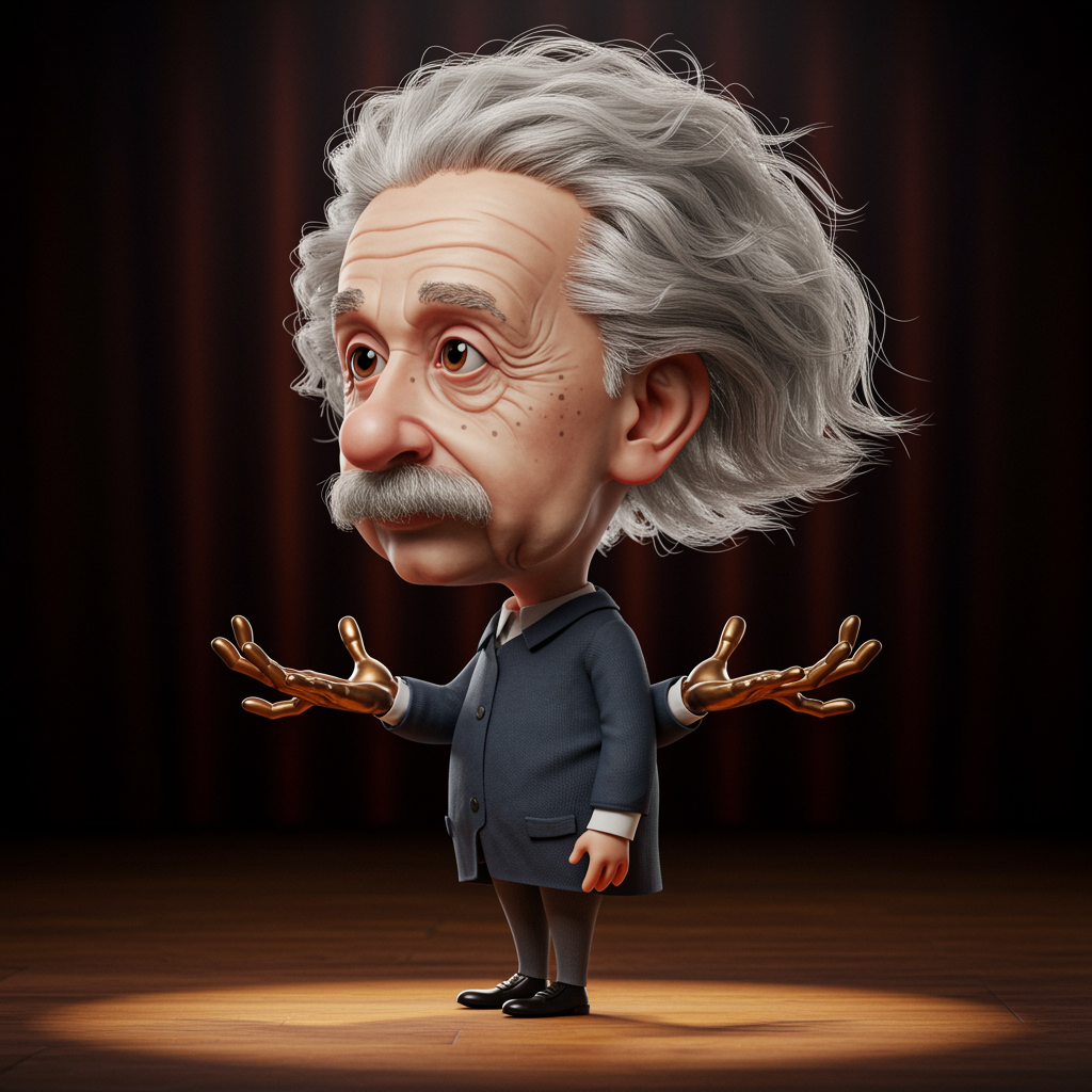 Character portrait of Albert Einstein, standing on stage, side profile, caricature, chibi, kawaii, 3D rendering, octane rendering, volumetric light, Victorian fashion, metallic, highly-detailed symmetric face, detailed expressive eyes, ultra sharp, highest quality, art by Anja Millen, George Cruikshank, Bordalo II, smooth, sharp focus, trending on artforum, Behance HD, kids storybook style, muted watercolor shades, whimsical charm, two faces intertwining, cropped frame, intricate and abstract hands, signature style, surreal elements, elongated neck, artistic distortion, dreamlike floating limbs, fantastical proportions, imaginative anatomy, playful surrealism, richly detailed, whimsical design, creative adaptation, reimagined essence, vibrant yet subtle, harmonious blend of styles.