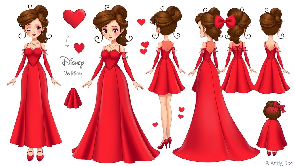 Character sheet, Disney-inspired Valentine, girl with styled top hair, 3D-printed appearance, wearing a large red gown, fully visible gown with multiple views, simplicity in detail yet unique and creative, doll-like aesthetic, showcasing various poses and expressions, highly detailed with depth and multiple components, aspect ratio 3:4, creative twists on core elements.