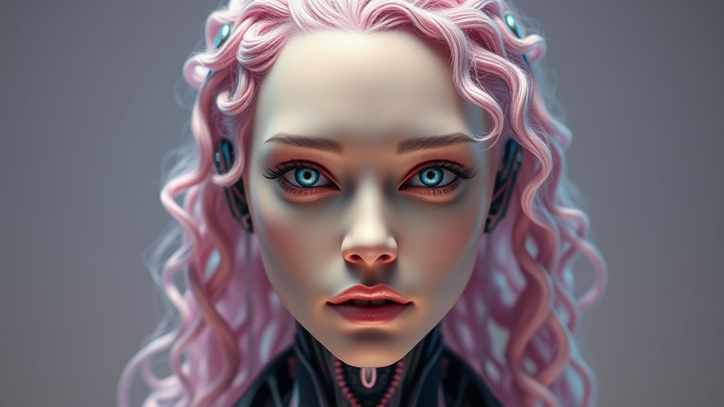 Character Sheet long curly pastel pink hair intricate 3d render ultra detailed front-facing porcelain woman android visage cyborg mechanical elements captivating studio soft illumination back light vivid nuances opulent cyberpunk lace hyper realistic anatomical intricate facial structures cable electric wiring microchip sophisticated exquisite backdrop octane render inspired by H.R. Giger style with subtle creative alterations highlighting ethereal beauty and modern elegance.