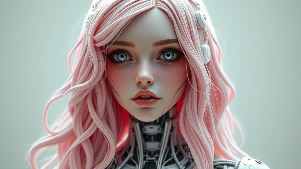 Character Sheet, Long wavy pastel pink hair, intricate 3D render highly detailed of a striking porcelain-faced female android, cyborg elements, exposed robotic components, exquisite studio soft lighting, halo light effect, vivid intricate details, opulent cyberpunk, delicate lace patterns, ultra-realistic, anatomical features, visible facial musculature, intricate network of cables and electric wires, microchip accents, sophisticated elegance, stunning backdrop, rendered in octane, influenced by H. R. Giger's visionary style.