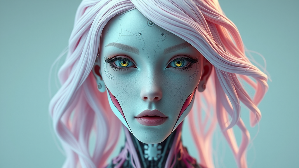 Character sheet, stunning long wavy pastel pink hair, intricately detailed 3D render of an exquisite porcelain front-facing female android, a mesmerizing fusion of cyborg and human, showcasing delicate robotic elements, ethereal studio lighting, subtle rim light, strikingly vibrant details, opulent cyberpunk aesthetic, intricate lace accents, hyper-realistic anatomical features, visible facial muscles intertwined with sleek cable electric wires, embedded microchip details, refined beauty, captivating background, rendered with octane, influenced by H. R. Giger's otherworldly style.