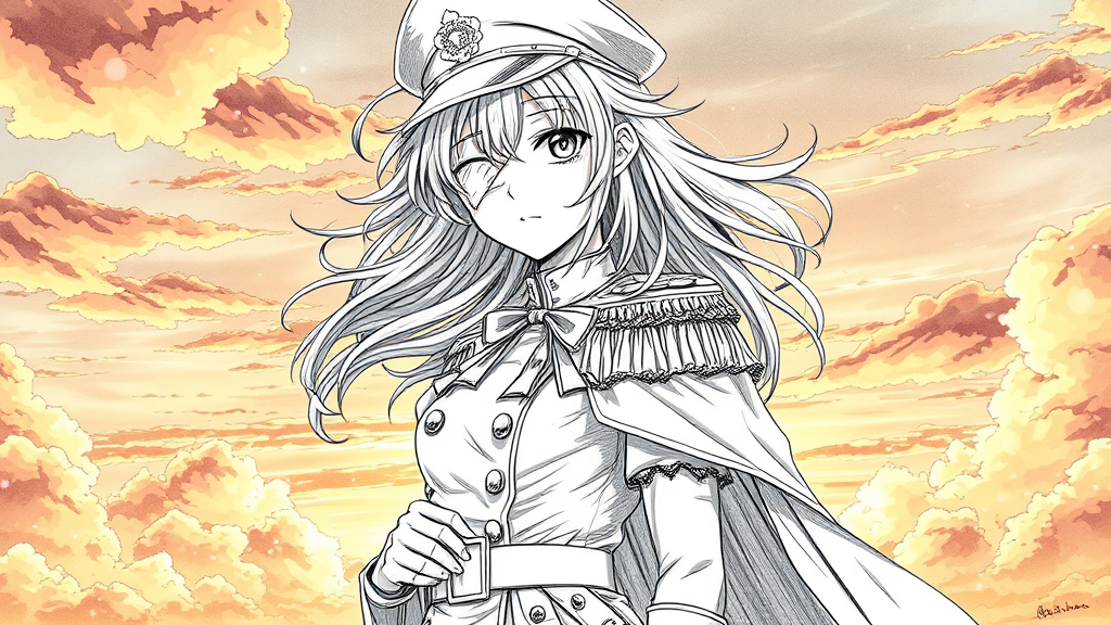 Character standing against a vibrant sunset sky, a graceful figure with disheveled hair that flows freely in the breeze. Her face, exceptionally delicate and beautiful, is framed against the backdrop of clouds, her expression a poignant mix of determination and sadness, accentuated by a bandage over one eye. She stands in a dynamic pose, clad in an intricate military uniform complete with a cape and hat, adorned with lace, ribbons, and stockings that add a touch of elegance to her powerful presence. Light particles dance around her in the fading sunlight, casting a magical glow. Her detailed eyes, alive with emotion and depth, lock onto the viewer. The pencil-like precision of her form, with clear lines etched in black and white, captures every meticulous detail, from the finely-rendered fabric to the delicate contours of her face and hands clad in white gloves. A sense of motion and energy is palpable, as if she is poised to take flight over an unseen battlefield, her story told through each expertly drawn line and shadow. This scene, captured in stunning high-res quality, combines elements of official art and game concept, merging the richness of color with the refinement of traditional illustration, resulting in a truly breathtaking image.