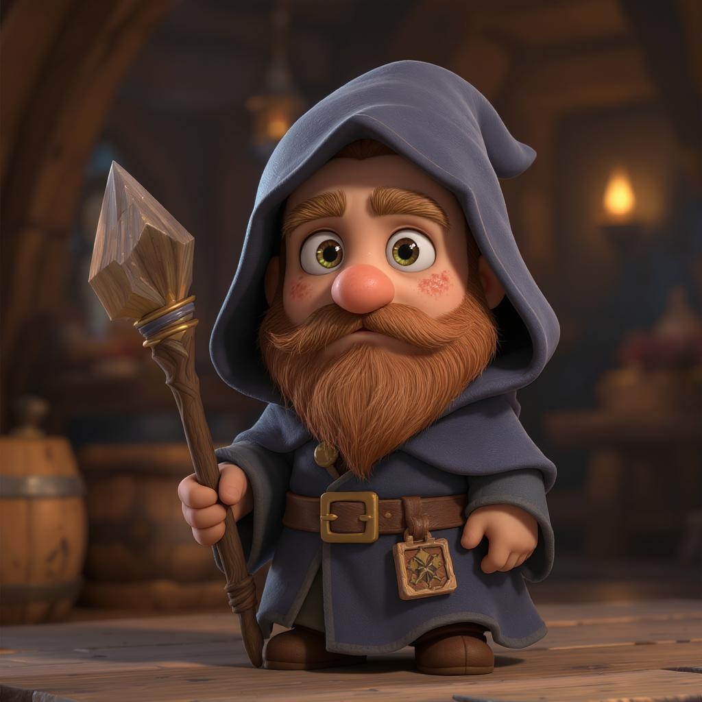 Character wizard, hooded cloak and robe, man with a beard, styled in chibi form, solo figure, Disney-inspired artwork, unreal engine influence, cozy indoor lighting, fantasy setting, artstation quality, digital painting, cinematic feel, character design by Mark Ryden, Pixar, and Hayao Miyazaki, created in Unreal Engine 5, Daz influence, hyperrealistic approach, octane render, located in a medieval tavern, featuring freckles, maintaining charm despite humorous imperfections, unique artistic expression, playful yet detailed, evoking the style of classic animated films, embracing imaginative elements while ensuring character vibrancy and presence.