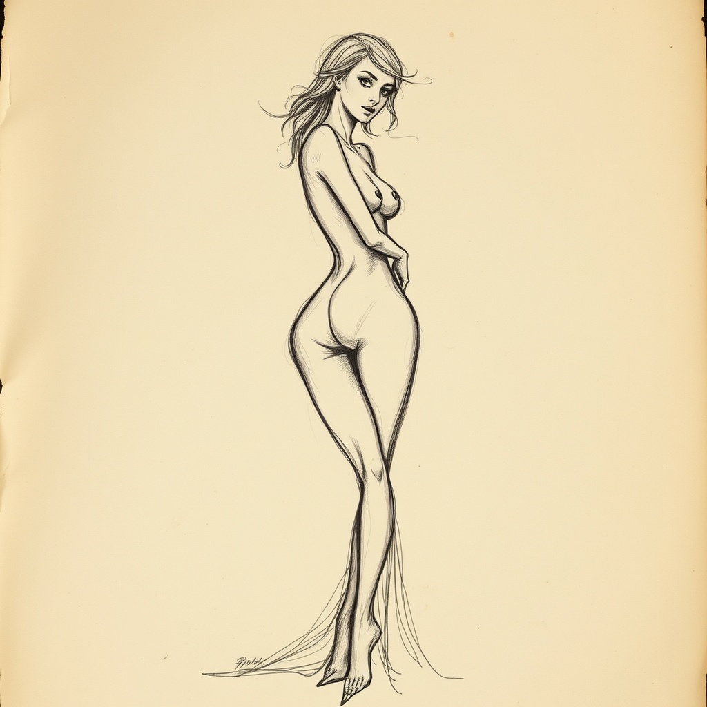 View this AI-generated image featuring a rough charcoal sketch on aged parchment featuring a stunning female figure in an alluring pose characterized by clear elegant line work highlighting the contrast between raw texture and refined artistry. Created using advanced AI technology, this image showca