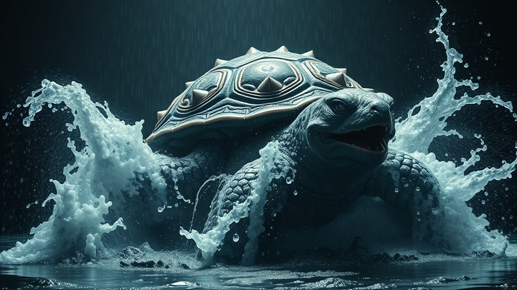 Charging sinister Pokémon Blastoise, a colossal monster turtle unleashing a torrent of water, drenched, dense, contorted, eerie, with a macabre influence. Crafted with intricate details and design, it is illuminated by dramatic, theatrical lighting, capturing hyperrealistic, photorealistic features in a cinematic style, rendered in 8k resolution with an aspect ratio of 9:16.