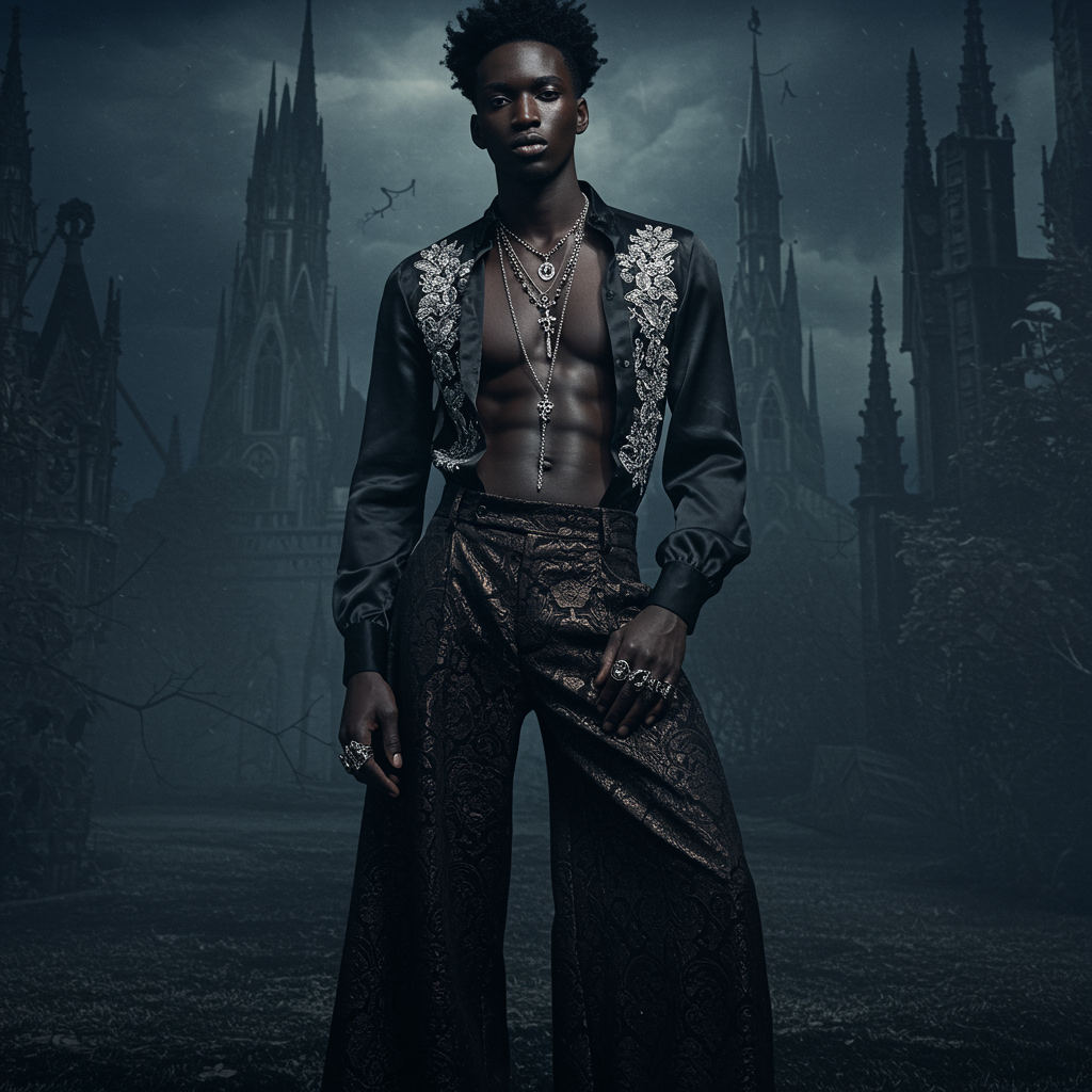 charismatic black man in a gothic dreamscape fashion editorial where the dark elegance of the backdrop contrasts with lavish, avant-garde attire highlighting intricate textures and bold accessories