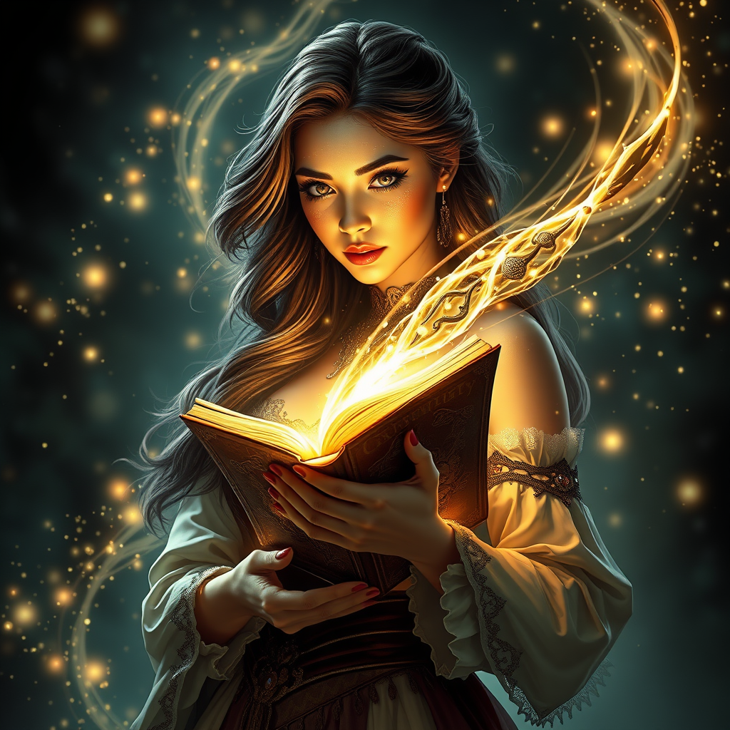 Charismatic woman clutching an enchanted tome| mystical shimmering paths| ethereal light particles| mystical attire| intricately detailed fantasy illustration| dramatic illumination| crystal-clear definition| surreal| digital render| ultra-high definition.