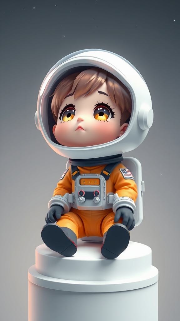 Charming 3D rendering of a petite female explorer with a helmet, an adorable digital art piece featuring a stylized mini girl in a space suit, sitting on a white pedestal. The cute anime-inspired digital painting showcases the little astronaut with big, sparkling eyes gazing up in wonder. The detailed and charming render captures the essence of a space cadet in a colorful, imaginative setting, blending elements of innocence and adventure in a whimsical, scene-stealing portrait.